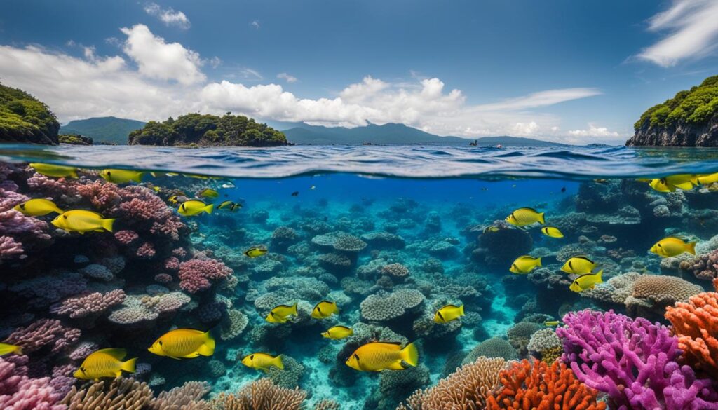 Okinawa is the crown jewel for snorkeling in Japan. It offers an unmatched adventure with friendly marine life and locals. The water’s surface shines in shades of blue and turquoise. Below, it’s a vibrant world that excites every snorkeler, whether you’re new or experienced.